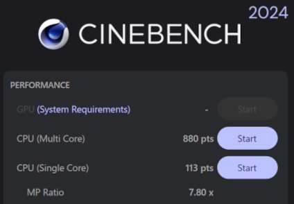 CPUの性能をCINEBENCH R23と2024という2つのソフトを用いて測定しました。スコアはそれぞれ15014pts、880ptsとなりました。非常に高い性能です。