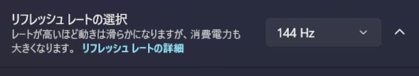 ディスプレイのリフレッシュレートは144Hzとなっています。とても滑らかな表示が可能です。