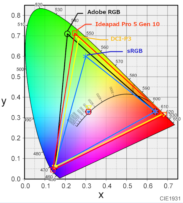 表示できる色の範囲は以下のようになっています。今回のレビューで使用した製品のディスプレイは、sRGBカバー率、DCI-P3カバー率ともに100%でした。表現できる色の量が多く、とても広い色域です。