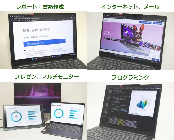 大学の学業で必要になる講義レポートや資料の作成、インターネットや動画視聴などはもちろんのこと、プログラミングや画像・動画編集など負荷のかかりやすい作業にもしっかり使うことができます。
