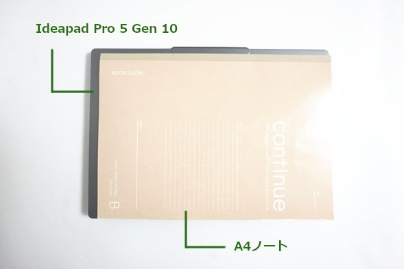 実際に、Ideapad Pro 5 Gen 10 14型AMDの上にA4ノートを重ねてみたところ、PCの方が少し大きいだけで、A4とあまり変わらない大きさでした。コンパクトにできています。