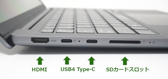 HDMIポートとUSB Type-Cポートが搭載されていて、大学でプレゼンを行ったり、自宅でモニターをつないで2画面で作業したりすることができます。
