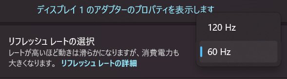 リフレッシューレートについては60Hzと120Hzとで切り替えることができるようになっています。ゲームをしなければ60Hzで問題なく使うことができます。