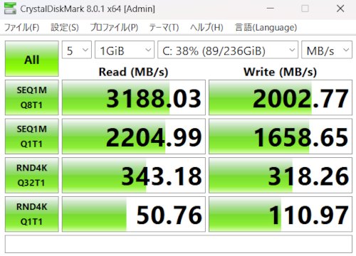 ストレージであるSSDの読み書きの速度を計測しました。高速な動作が可能になっていてとても快適です。問題なく使うことができるでしょう。