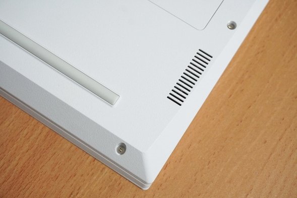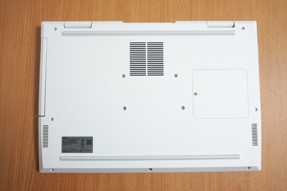 底面です。右側の小さな四角形の部分の蓋を開けると、メモリスロットにアクセスすることができます。