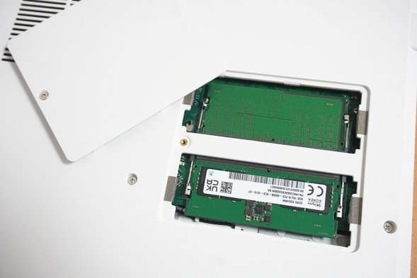 メモリは本体底面にある裏蓋を開けてアクセスする。ドライバーを回せば、自分でメモリの交換・増設ができる。