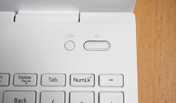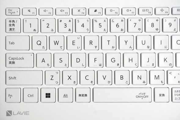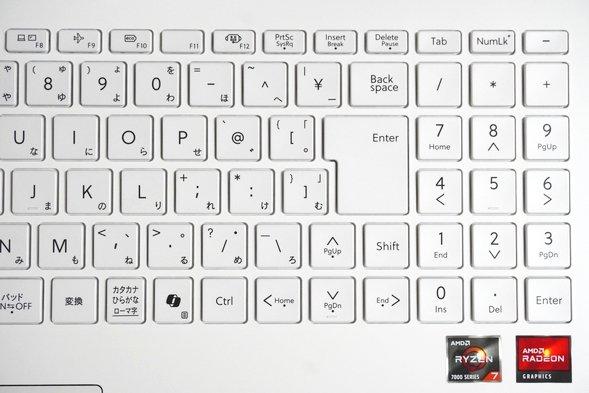 キーボードの右半分です。Shiftキーがやや小さく、上矢印キーがShiftキーと「ろ」キーの間に入り込む仕様になっています。このような仕様は時々見かけますが、念のためご注意ください。また、テンキーは3列構成になっています。