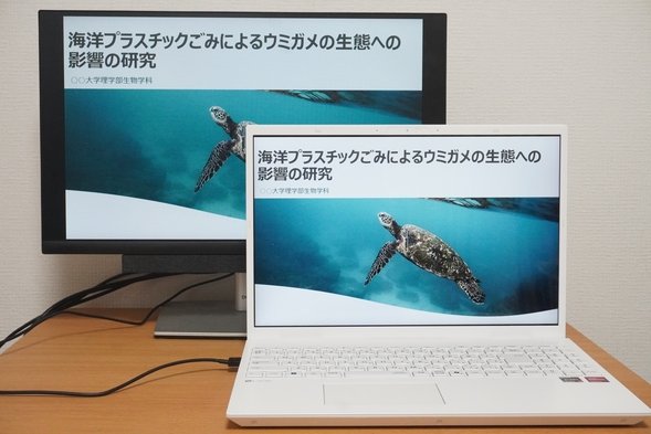 モニターにPCと同じ画面を映し出したところ。PCの画面を拡張して、モニターと違う画面を表示させることも可能。