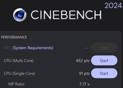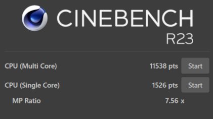 CPUの性能を計測しました。CINEBENCH R23と2024という専用のソフトを使って計測し、それぞれ11538pts、652ptsという高いスコアが得られました。
