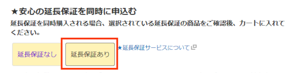 下の画面のように、延長保証の種類や選択した商品の内容が表示されます。希望する延長保証の種類を確認して問題なければ、「カートに入れる」ボタンをクリックします。