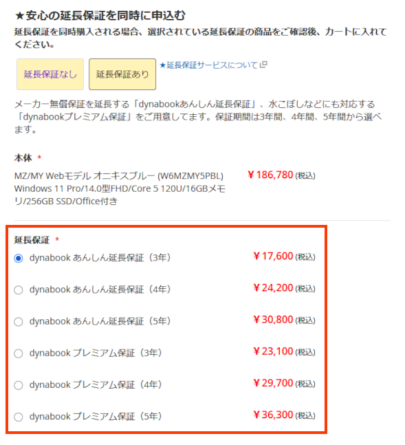 通常、3年~5年の延長保証をつけることができます。通常のメーカー保証であればdynabookあんしん延長保証、自然故障以外にも水こぼしや破損、落雷などによる故障にも対応したいのであればdynabookプレミアム保証を選択してください。