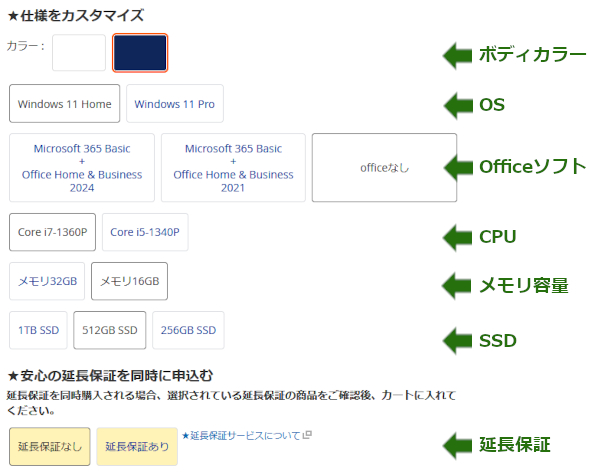 たとえば、次の画像の例では、ボディカラーやOfficeソフトの有無、OS、CPUやメモリ容量、ストレージ(SSD)の容量などが選択できます。