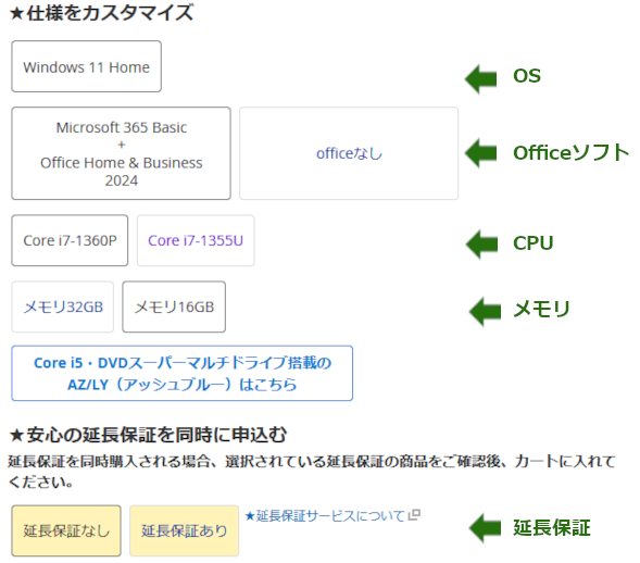 ページ中央のところで、ノートパソコンの構成をカスタマイズすることができます。カスタマイズできる範囲はモデルによって違ってきます。