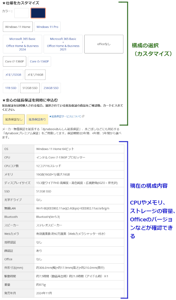 Dynabookダイレクトでは、ノートパソコンのカスタマイズ画面は下の画像のようになっています。