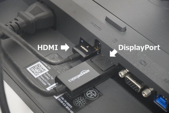たとえば、普段はDisplayPortにノートパソコンを接続するようにし、スマホやゲーム機などはHDMIケーブルを使うというようにすることができます(逆のパターンでも大丈夫です)。