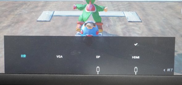 モニターに搭載されているボタンを押すと、DisplayPortからの入力か、HDMIからの入力かを切り替えることができます。ケーブルをいちいち外さなくても簡単に切り替えることができて便利です。