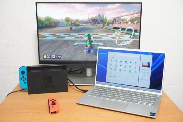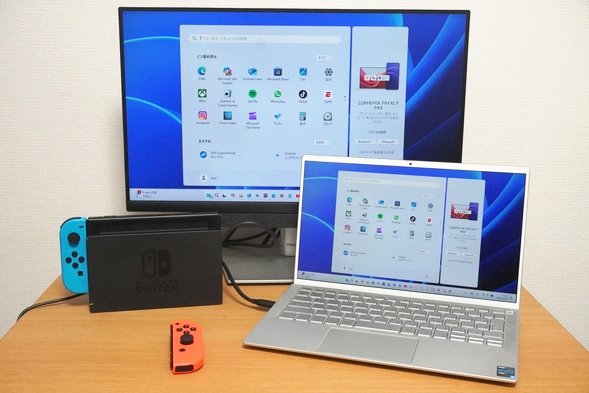 実際に、モニターとノートパソコン、そしてSwitchゲーム機をつないでみました。