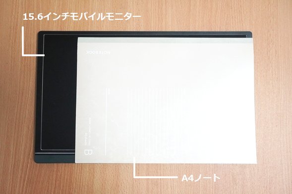15.6インチのモバイルモニターとA4ノートとの大きさ比較。