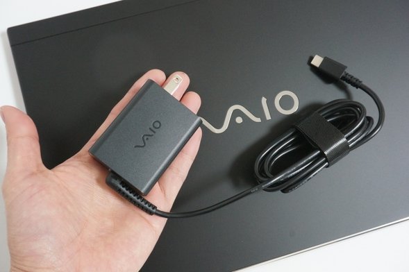 ACアダプターです。非常に小さくて軽いです。他のノートパソコンと比較しても、トップクラスのコンパクトさと軽さです。ACアダプターを持ち運ぶ場合でも邪魔になりません。