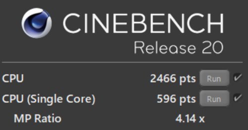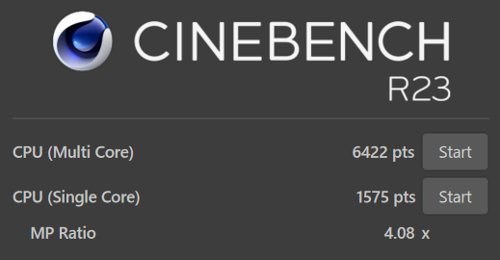 CPUの性能を計測しました。標準モードで2466 pts(CINEBENCH R20)、6422 pts(CINEBENCH R23)となっていて高いスコアです。とても快適に使うことができるでしょう。