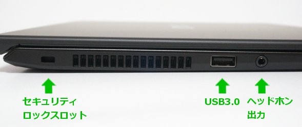 本体左側面です。セキュリティロックスロット、USB3.0ポート、ヘッドフォン端子が搭載されています。